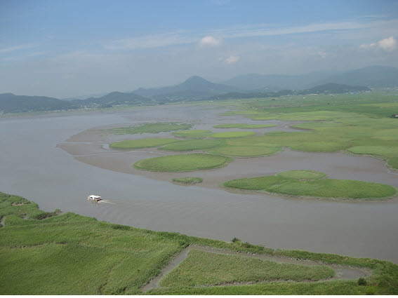 미륵산 케이블카를 내려와 곧바로 순천의 갈대숲을 보기 위해 달렸다. 저녁노을과 함께 보면 더 멋있다는 말을 들어서 인지 빨리 달렸으나 이미 해는 저물어 갔다. 그러나 한가로운 고속도로를 달리면서 지는 노을도 볼 만 했다. 이번 여행을 위해서 마련한 푸조3008은 윗천장을 드러내고 하늘을 볼 수 있어서 더욱 멋진 저녁노을을 배경으로 한 드라이브 풍광을 선사했다. 순천만에 도착하여 민박집을 찾으려다가 주차장 바로 옆에 있는 ‘흑두루미’민박집을 찾아가 방이 있는지 물었다. 다행이 방이 1개 남아 있었는데 넓은 방을 10만원에 주었다. 너무 운이 좋았다. 아이들도 만족해 했다. 그 민박집 뒤에 ‘대대밭’이라는 음식점이 있는데 그곳에서 짱뚱어전골을 시켜 먹었다. 짱뚱어 전골은 마치 미꾸라지와 비슷하여 추어탕과 같은 맛일 거라고 생각했지만 훨씬 고소하고 맛있었다. 나는 음식점의 손맛을 보는데 그 기준은 주된 메뉴가 아니라 밑 반찬의 솜씨로 평가한다. 그런데 보통 유명관광지 주변의 음식점이 맛이 별로 없는 것과 달리 그곳에는 짱뚱어전골뿐 아니라 밑반찬도 맛있었고 더구나 ‘대대포’라는 막걸리가 더 일품이었다. 대대포는 그곳 쌀로 빗었다는 술로 시에서 위스키를 본따서 ‘Blue Label'이라는 상표를 붙여서 개발, 판매하고 있었는데 맛이 달지 않고 깔끔했다. 그래서 그날 저녁 내가 몰래 나가서 그집 식당 문을 닫기 직전 1병을 더 사와서 마셨다. 그날 저녁 술에 취한 내가 아들과 함께 방안에서 술래 잡기를 했다. 아들은 다음날 아침 나에게 ‘마치 술취한 곰 같이 잡아 먹으려 날뛰었다’고 표현했다. 8시30전에 순천 생태공원이 입장하면 입장료를 내지 않아도 된다는 민박집 주인의 말에 서둘러 들어갔다(사실 보니, 공무원이 출근하지 못하여 무단입장을 한 것임). 순천만을 한눈에 볼 수 있는 전망대가 용산 전망대인데 용산이라는 산에 설치한 거라서 그렇게 이름 지은 듯 했다. 전망대로 가는 길이 갈대숲사