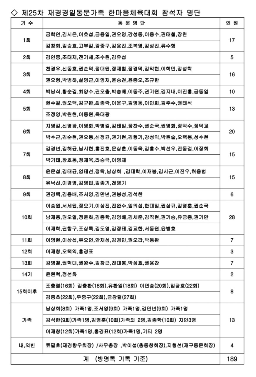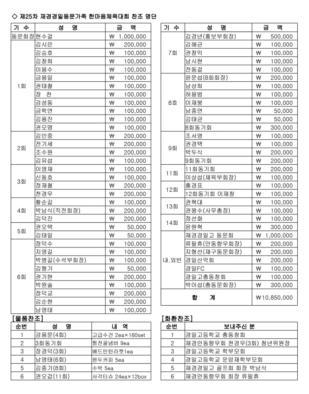 제25차 재경경일 춘계한마음체육대회 참석자 및 찬조하신 분들의 명단입니다.