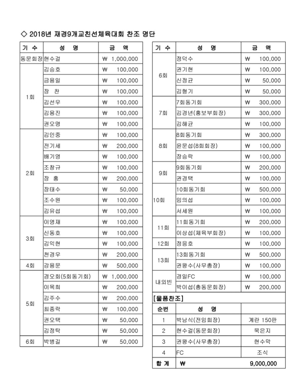 [ 9개교체육대회 참석자및 찬조내역 ]