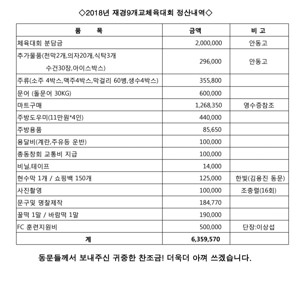 회칙 제22조 3항(각종행사의 결산은 감사와 협의하여1개월 이내에 공지한다) 의거 장경덕 수석 감사와 협의후 공지하는 것이며, 증빙 서류등 의문사항 문의는 사무총장에게 요청하시기 바랍니다.