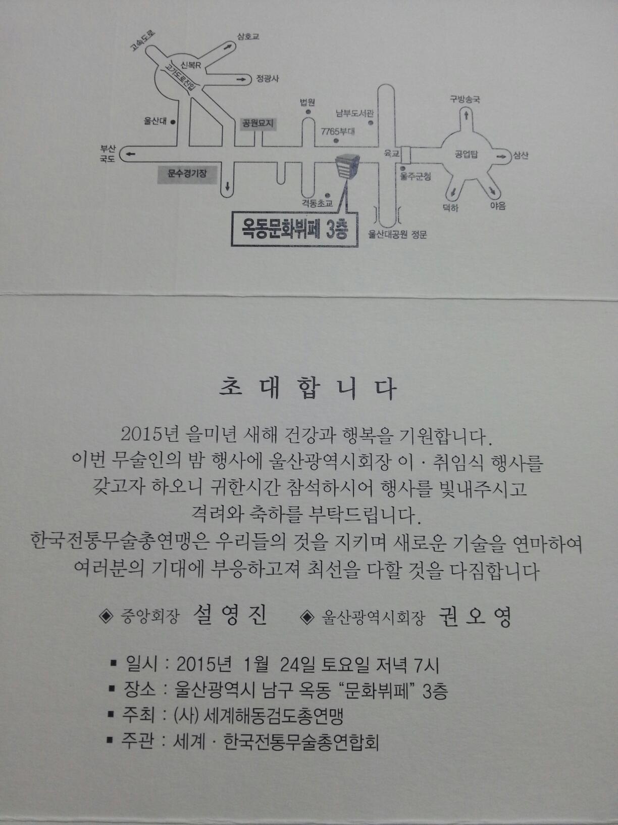 해동검도총연맹 울산광역시회장ㅡ경일 2회 권오영 동문님 취임ㅡ재울경일인의 경사스런일입니다모두다함께 축하와 박수를보내드려야겠습니다아래와같이 취임식이 있아오니 많은동문님들이함께하시어 자리를 빛내주셨으면 감사하겠습니다.24일저녁7시 옥동 문화뷔페3층