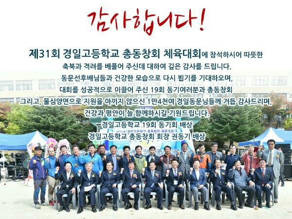 지난 10월11일(일) 오전9시부터 오후5시까지 모교 운동장에서 체육대회가 있었다. 19회 동기들 주관으로 지난 8월부터 19회 동기회장 유자연은 자주 연락이 오면서 많은 준비를 하는 가운데, 특히 재경안동9개교동문회 체육행사에 안동에서 동기들 여러명이 상경하는 등 적극성을 가졌었다. 이에 안동갈려는 사람들을 모으는 가운데 약20명 내외로 미니 관광버스 25인승을 대절하였다.