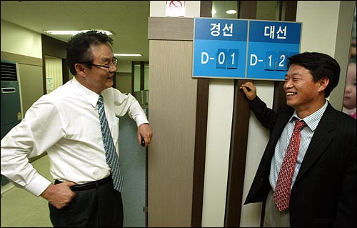 어젯밤(18일), 여의도 국회의사당 앞에 있는 박근혜 캠프 사무실에 들어서자 맨 먼저 눈에 들어온 것이 그 숫자였다. 마지막 선거운동일의 긴장감이 사무실을 덮고 있었다. 홍사덕 공동선거대책위원장은 "역전을 확신한다"면서 지역 일꾼들에게 격려전화를 연신 했다. '<조선일보> 기자' 대신 '박근혜 공보특보'라는 명함을 내민 허용범 특보도 인터뷰를 위해 마주 앉는 순간까지 마지막 운동을 했다. 그는 핸드폰으로 상대방에게 이렇게 말했다.