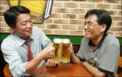 | ▲ 18일 밤 여의도 박근혜 캠프 사무실 부근 한 호프집에서 <조선일보>를 퇴사한 뒤 박근혜 캠프에 합류한 허용범 전 <조선일보> 워싱턴 특파원(왼쪽)과 오연호 오마이뉴스 대표기자가 잔을 부딪히고 있다. |