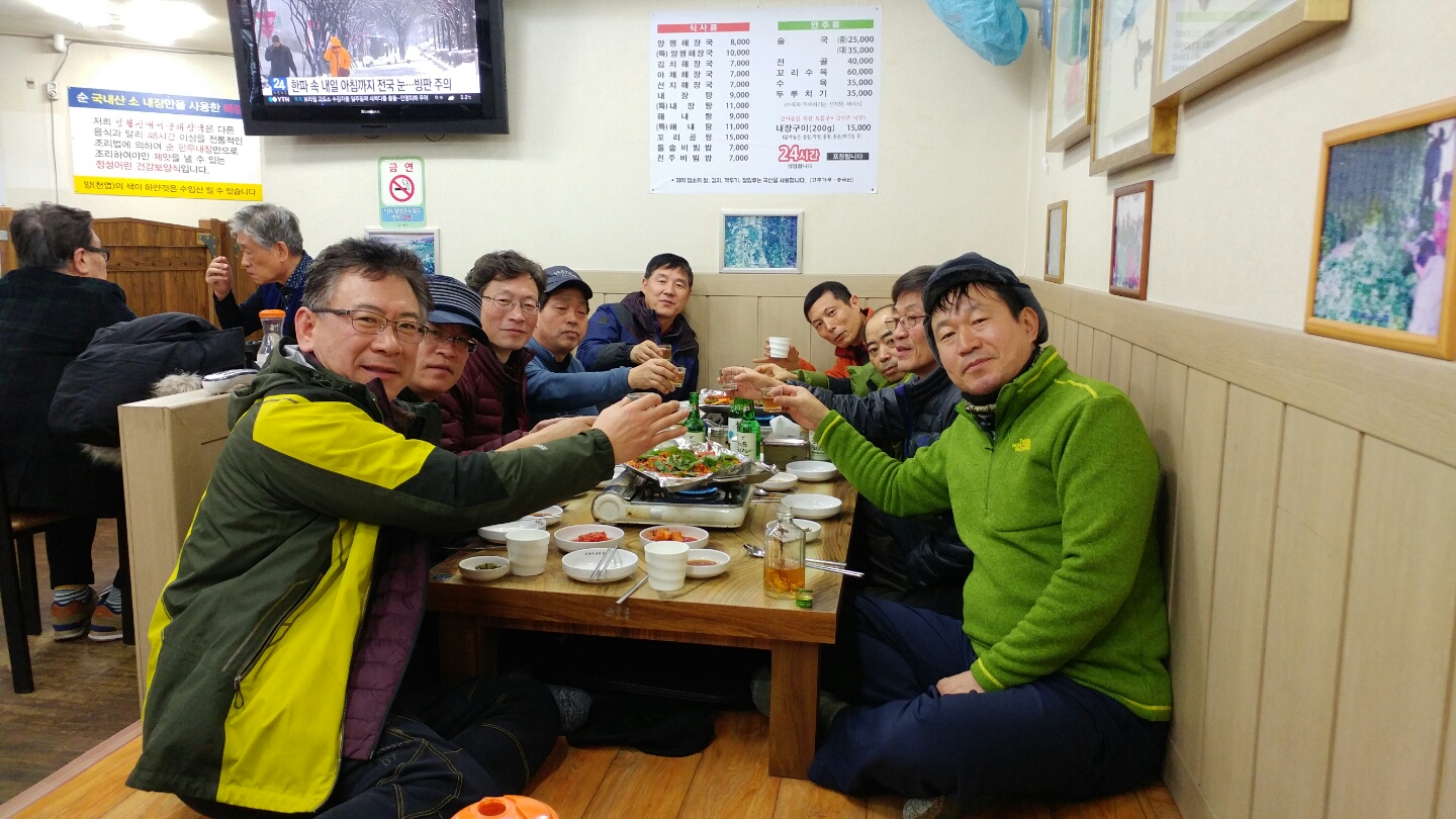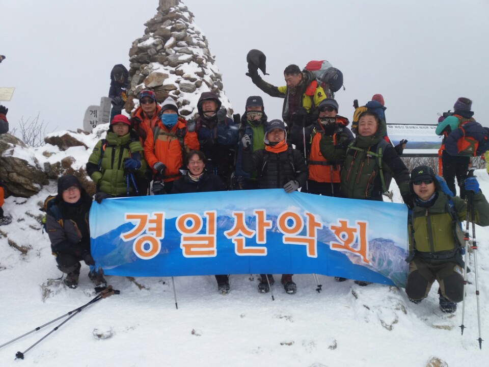 지난 21일 경일산악회는 평창 계방산을 다녀왔습니다. 전날 내린 눈으로 산객들이 모두 계방산으로 모인 듯 인산인해였습니다. 눈길이라 산행에는 수월하지는 않았지만 회원 모두 안전 산행을 하였습니다. 전망대 근방에서 비닐을 뒤집어쓰고 준비해온 어묵탕과 배추전, 홍어 등과 특히 회장님이 준비해 오신 구찌뽕 술로 산행의 피로를 날려버렸습니다. 이날 참석해 주신 회원님들 감사드리고, 2월 정기산행은 18일(토) 삼성산에서 시산제을 준비하고 있습니다. 많은 참석 부탁드립니다. ▲참석자 : 김용진, 권오명, 박남식, 김덕진, 정덕교, 김경년, 권창익, 김해균, 남상희, 이재붕, 조서영, 이승원, 게스트 : 여성회원 3명 ▲찬조 : 김용진 5만원, 박남식 10만원 ▲비용 결산 일자 | 수입 | 지출 | 잔액 | 2017.1.1 | | | | 1.12 | 200,000원 (동문회 후원금) | 100,000원 (정기총회 협찬) | 1,458,238원 | 1.21 | 470,000원 | 737,500원 | 1,190,738원 |