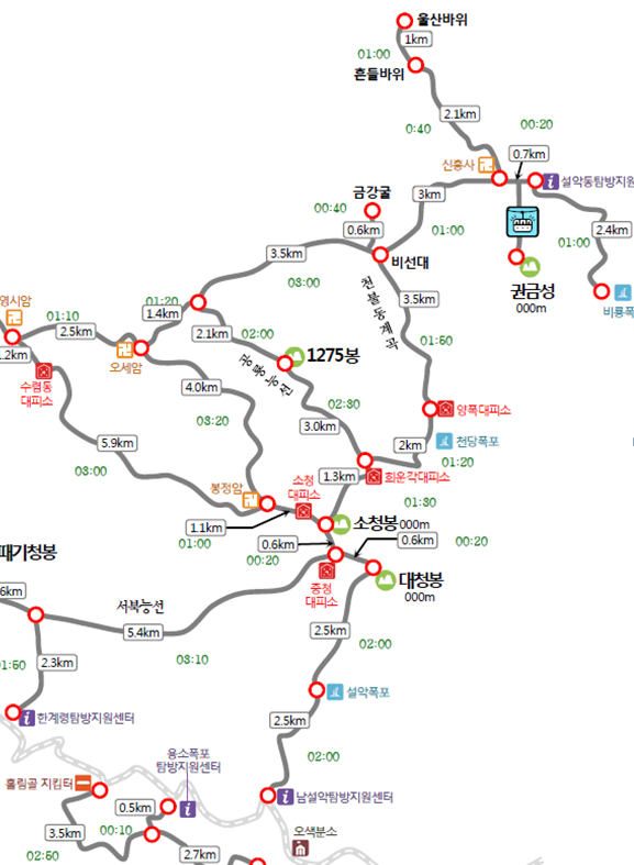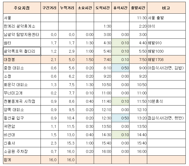 경일산악회는 지난 5월 설악산 십이선녀탕계곡을 안전하게 다녀온 경험을 바탕으로 6월에는 설악산 최고봉인 대청봉을 오르기로 하였습니다. 경일산악회 회원님들의 적극적인 참여를 부탁드립니다. ▲ 일시 : 2018. 6. 16(토) ※ 출발 6.15(금) 23:30 예정 ▲ 승차 장소 : 압구정역 1번 출구 ※ 상황에 따라 변경 가능 ▲ 코스 : 오색 탐방지원센터 - 설악폭포 - 대청봉 - 중청 산장 - 회운각 대피소 - 양폭대피소 - 귀면암 - 비선대 - 신흥사 - 설악동 소공원 (총거리 16km) ※ 뒷풀이 : 설악동 회센터 ▲ 회비 : 50,000원 ▲ 준비물 - 개인 : 행동식 2회분, 과일 2회분, 식수 1리터, 방풍자켓, 헤드랜턴, 스틱, 무릎보호대, 여벌 옷 및 슬리퍼 - 공동 : (아침, 점심)은 김밥, 라면 ※ 차량 예약관계로 6월 5일(화)까지 참석여부 회신 부탁합니다. ▲ 참고사항(부탁말씀) - 대청봉 구간은 오르막 구간이 많기 때문에 배낭 무게를 자신 몸무게의 10% 이하로 준비하시기 바랍니다. - 자신의 산행 능력에 대한 판단과 소위 민폐 끼친다는 생각하지 마시고, 오로지 자신의 한계를 느껴보고, 그 한계를 넘는 자신을 찾고 싶으신 분은 참석하시기 바랍니다. - 실제 산행은 회원들의 상황에 맞게 일정을 조정하여 전원 설악동에 도착하도록 하겠습니다. ▲ 첨부 - 일정표