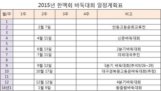 안녕하세요?한맥회 총무 이시봉입니다.벌써 앙상하던 나무가지 끝으로 파릇한 새싹의 움들이 살포시 잎들을 내밀고 있습니다.차갑던 바람들도 이제 한결 상큼함마져 느끼게 합니다.아뢰올 말씀은 2015년 한맥회 연간 대회일정을 안내 하오니 동문 회원분들께서 는 참고하셔서 많은 성원 바랍니다. 한맥회 2015년 연간대회계획 한맥회 회장 배기영 한맥회 총무 이시봉
