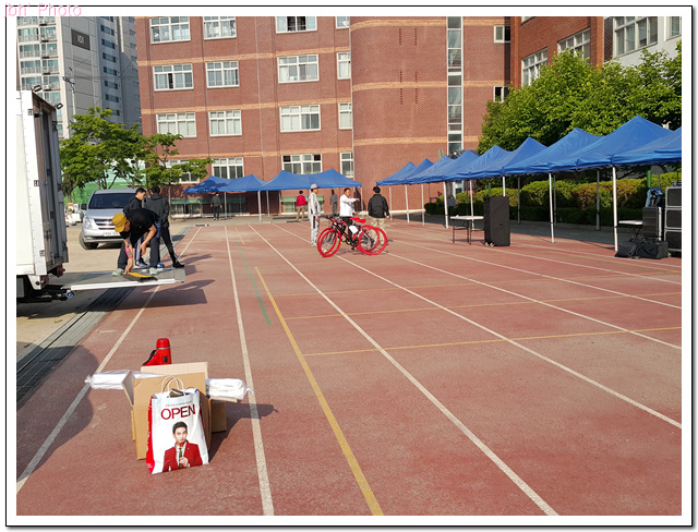 아침7시 이전에 벌써 행사용역업체 시설물 설치로 본부석과 기수별 텐트 등