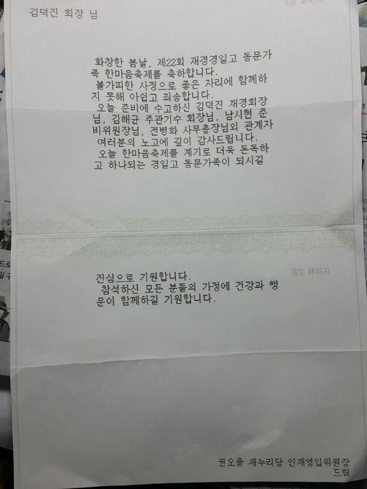 - 권오을 전 국회의원/전 국회 사무총장 축전